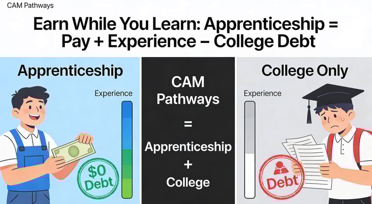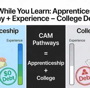 For learners and employers, apprenticeships offer a proven route to high‑skill, high‑wage careers without requiring a traditional four‑year degree. With more than 900 apprenticeable occupations recognized by the U.S. Department of Labor—including expanding opportunities in teaching, project management, and artificial intelligence—CAM Pathways can help students and business partners tap into this broad ecosystem, connecting community‑rooted learning with nationally recognized apprenticeship pathways that lead directly to meaningful work. With CAM, it is about competency (college or training), application (apprenticeship), and mastery (prove it).